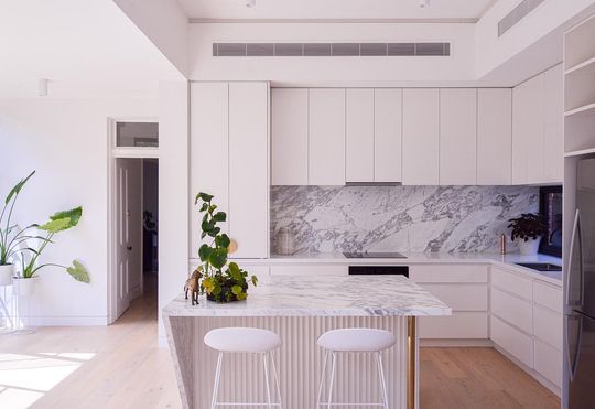 Inside, things just keep getting better. The kitchen is a minimalist dream: marble benchtops, no handles in sight, and enough bench space to host The Great Flemington Bake-Off (we made that up, but honestly… it could work). The green-tiled bathroom? A moody, luxurious retreat with just the right splash of glam thanks to gold tapware.