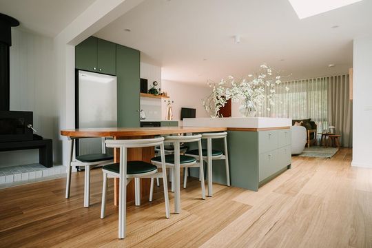 Originally a classic brick family house with a wooden lean-to extension at the rear, The Heath now balances its original mid-century charm with a calming contemporary core. The renovation prioritised openness and symmetry, replacing compartmentalised rooms with a flowing floor plan that enhances the home's sense of space. Central to this transformation is the reconfiguration of the kitchen and living zones into a central wing, with bedrooms and bathrooms positioned to either side. Walls were removed to create a seamless connection in this core zone, a skylight was introduced, and additional windows were installed to capture the northern light and frame views of the ‘heath’ beyond. Grounding this space is a kitchen island that integrates an elegant dining table—both a functional workspace and a casual dining area with seating for six.